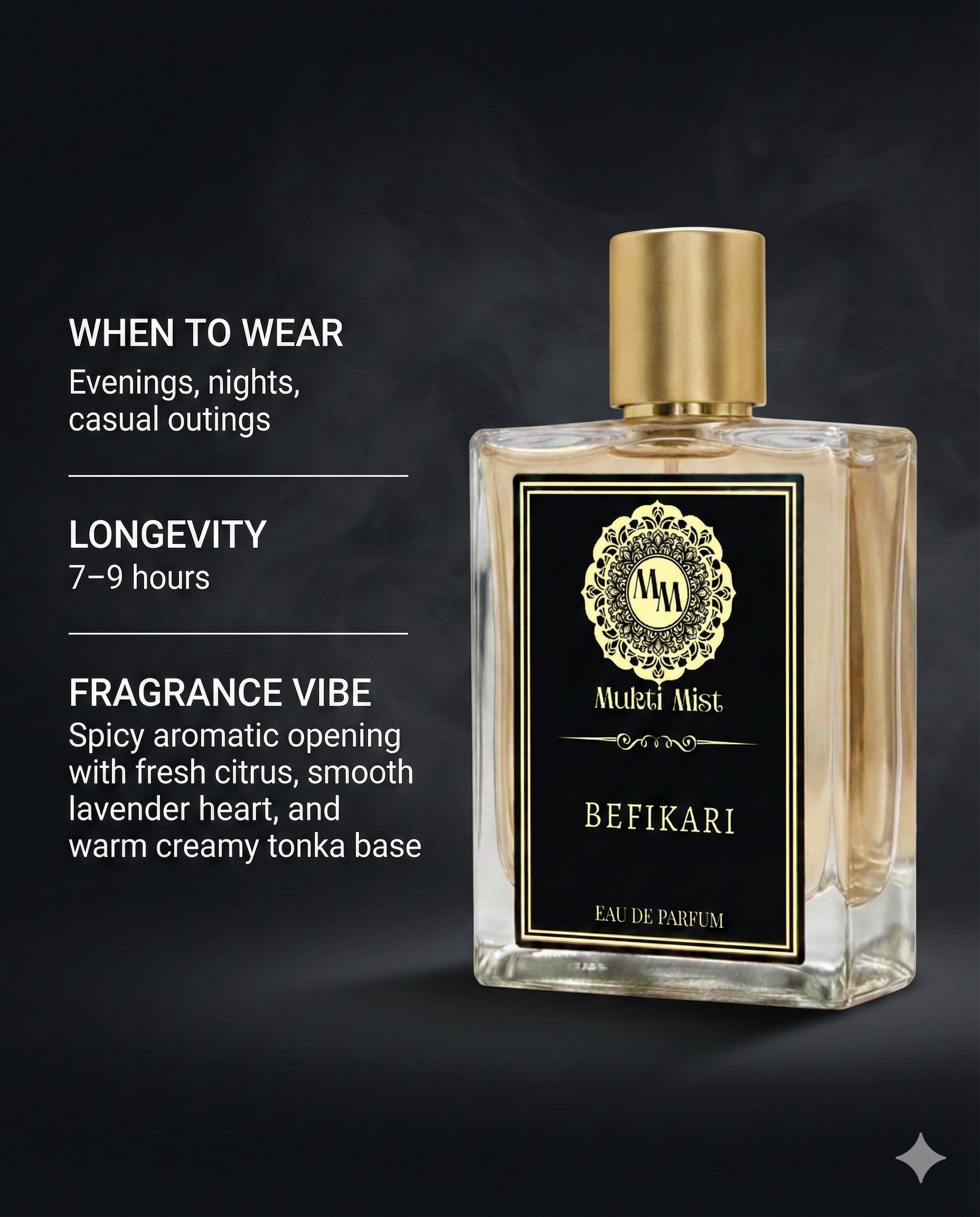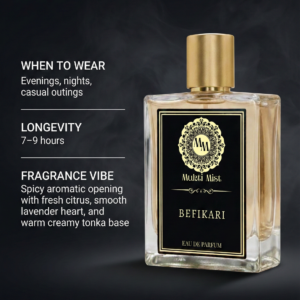 Designed for evenings, nights, and relaxed outings, Befikari is a versatile Eau de Parfum that transitions effortlessly from casual moments to memorable nights. Long-lasting and well-balanced, it delivers a premium fragrance experience—without excess or compromise.