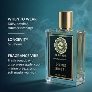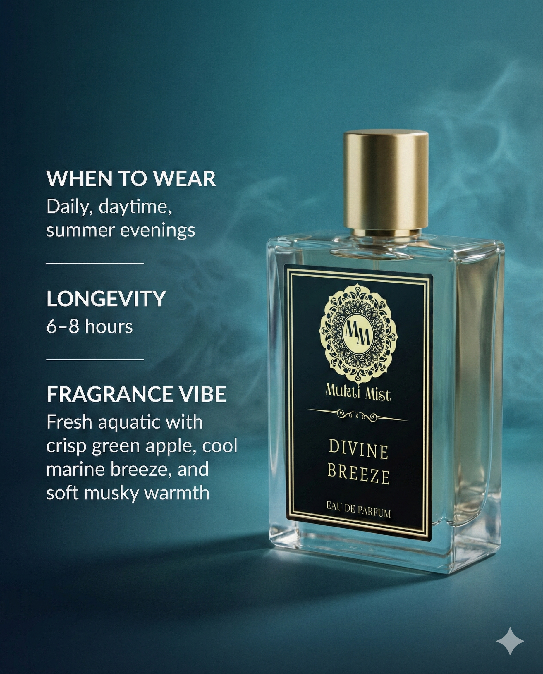 Light yet long-lasting, Divine Breeze is designed for daily wear, daytime outings, and warm summer evenings. It’s an easygoing yet refined Eau de Parfum—perfect for those who prefer freshness with a touch of elegance.